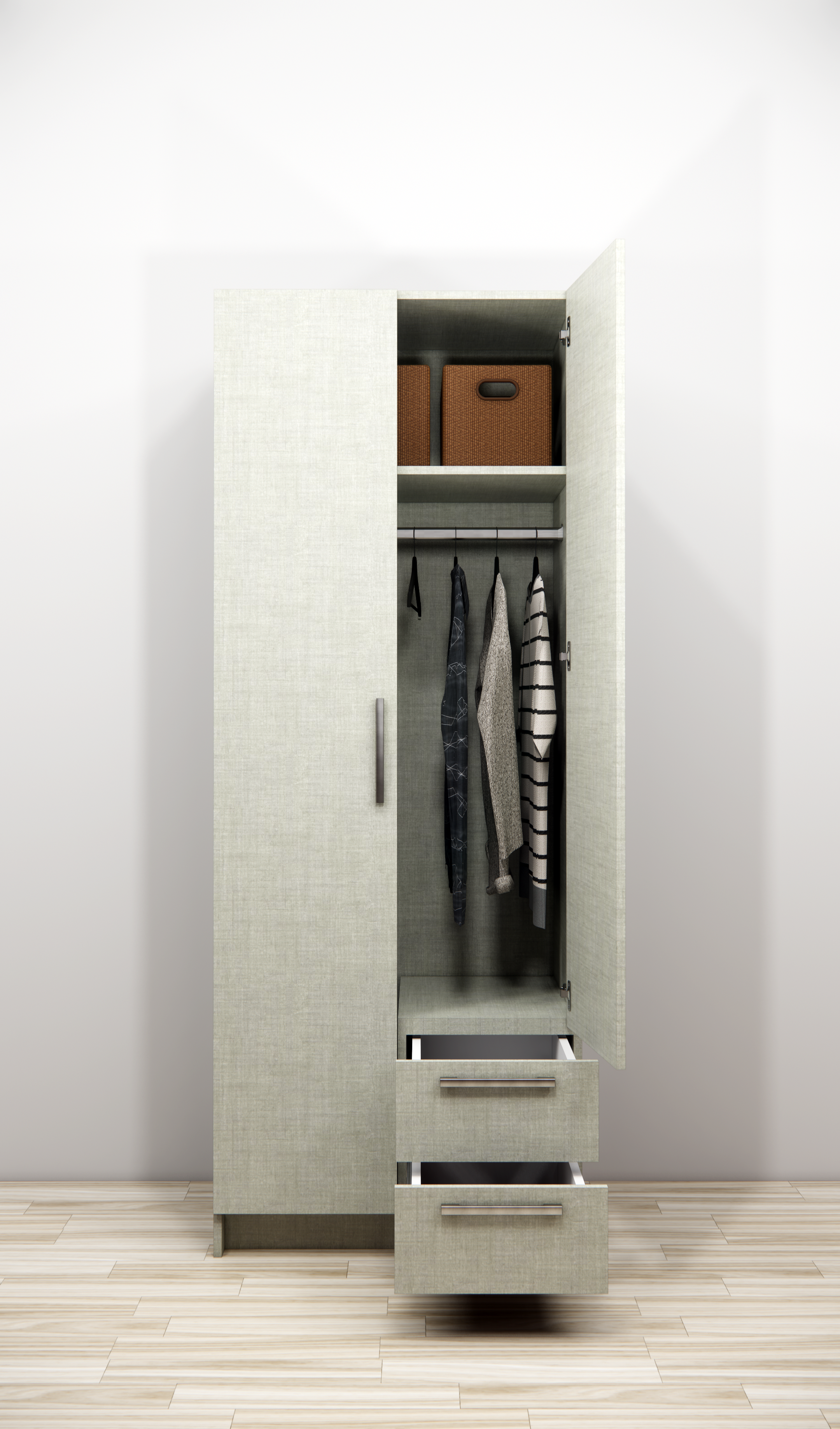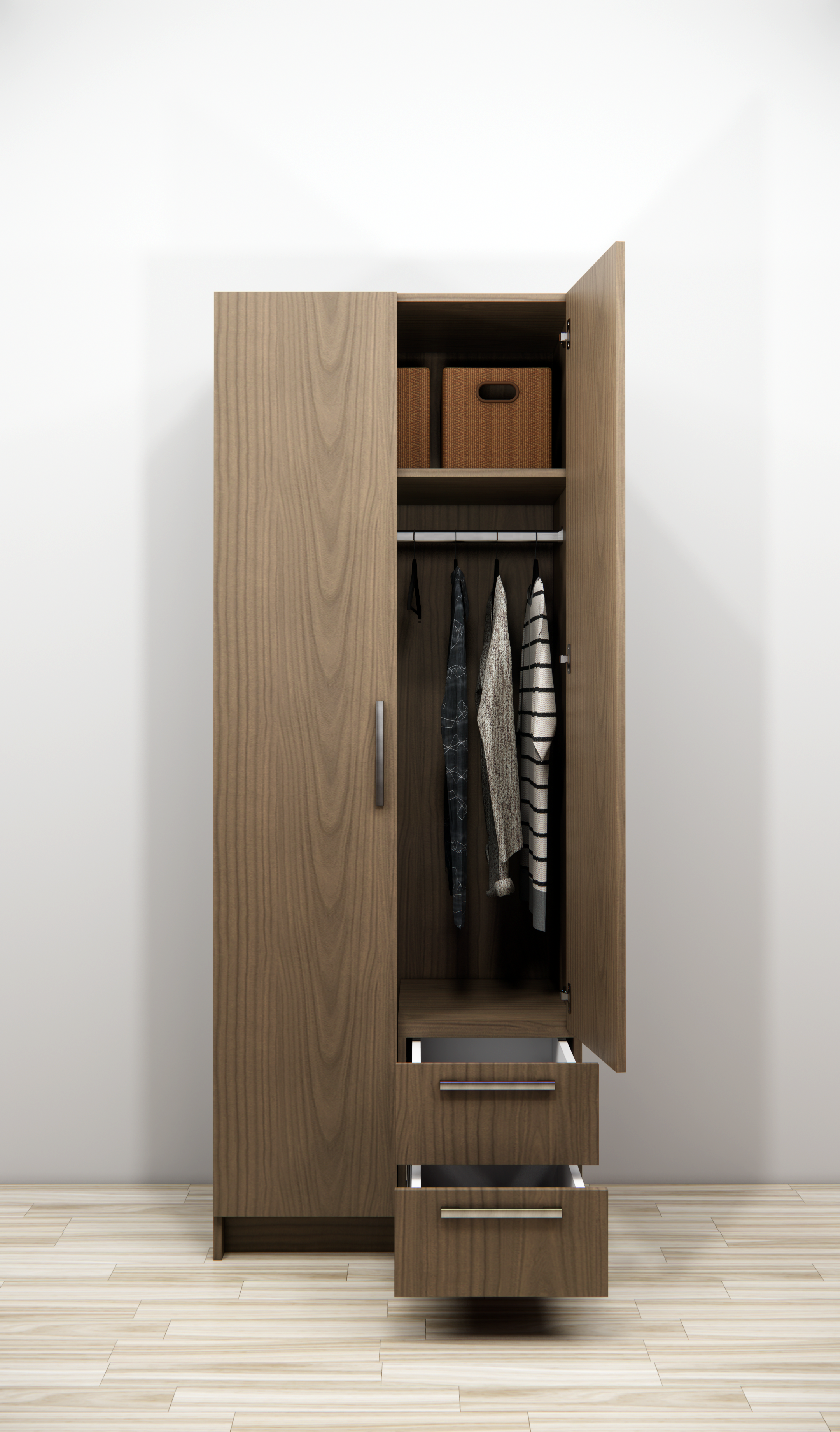The 2-Door Wardrobe blends classic craftsmanship with smart storage. Made from solid wood with a smooth, natural finish, it features a spacious hanging section behind double doors for garments and coats, plus two deep drawers at the bottom, perfect for storing folded clothes, linens, or accessories. Sleek metal handles and a clean-lined silhouette give it a timeless appeal that suits any bedroom style, from cozy cottage to modern minimalist.